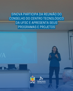 A SINOVA foi uma das convidadas a participar do momento e apresentou o Programa de Inovação e Empreendedorismo (Programa INOVA UFSC). Na pauta foram elencadas as ações do INOVA UFSC, além dos objetivos que devem ser alcançados. Outro destaque foram os programas e projetos que vêm sendo desenvolvidos em seu âmbito, além de indicadores de inovação em toda a universidade e seus campi.