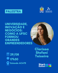 Nesta sexta-feira (29), às 17h30, no Estande ACATE, a Diretora de Inovação da SINOVA, Clarissa Stefani Teixeira, apresenta a de forma inédita o observatório da UFSC que indica empresas e empreendedores que já passaram pela universidade. O painel “Universidade, inovação e negócios: Como a UFSC formou grandes empreendedores” apresenta, em primeira mão, o maior mapeamento já realizado no Brasil sobre empresas e empreendedores das universidades.