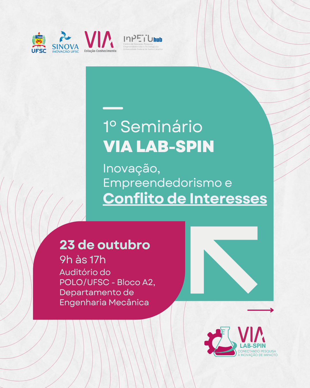 Na próxima quinta-feira, dia 23 de outubro, a partir das 9h, acontece o “1º Seminário VIA LAB-SPIN: Inovação, Empreendedorismo e Conflito de Interesses”, no Auditório do POLO/UFSC – Bloco A2, Departamento de Engenharia Mecânica (CTC/UFSC).