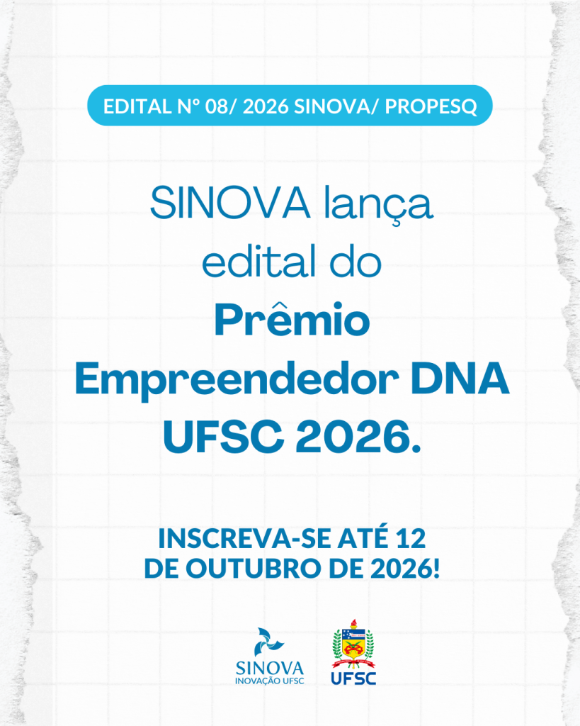 A SINOVA torna público o edital nº 8/2026, que abre as inscrições para o Prêmio Empreendedor DNA UFSC 2026.