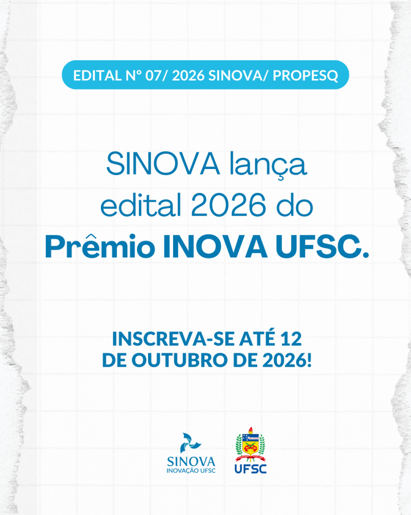A SINOVA torna público o edital com as condições gerais, regras e critérios de seleção e premiação de projetos para participação na “3ª Edição do Prêmio INOVA UFSC 2026”.
